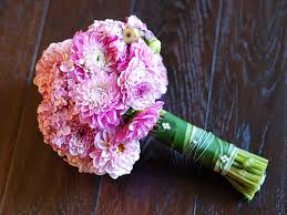 Dahlias - Variety of white, pinks, reds, oranges, purples. Large or small blooms. Check out this recipe you can bring to your florist for Burgundy Dahlia and Eucalyptus wedding bouquet from Wedding Chicks.